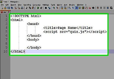 Set up your files and folders. Because you only need two files, you don't need any sort of complex filing system. As long as the two files are in the same level of the same folder it will work. So save both of your files in the same place. To save as html add a .html extension. Us a .js extension for the JavaScript file.Set up code in your files. The JavaScript file requires no setting up but the HTML does. In your HTML document add the following code: