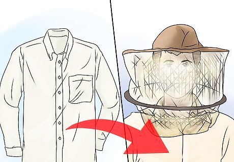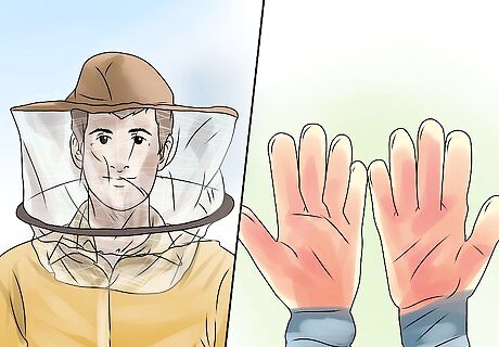 Put on your suit. When putting on the beekeeper's suit, put the hat on first, then the coveralls. Make sure the mesh of the hat is securely tucked in at the neck of the coveralls. Add gloves, socks and boots to the ensemble.