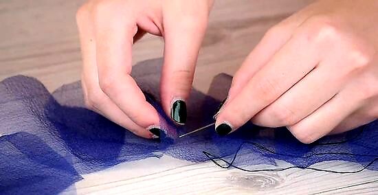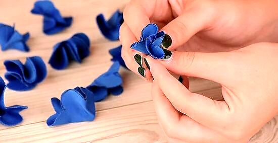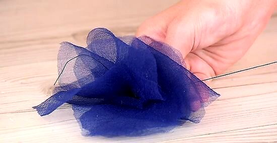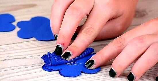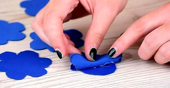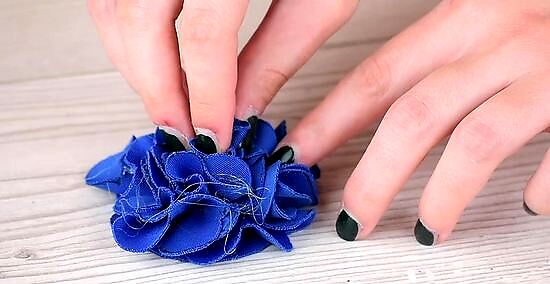 Gather the petals together. Pull the running stitch a little to gather to petals in a bunch. Tie a knot where the flower petals are gathered to keep them bunched up.