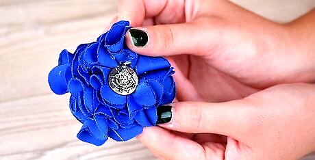 Add the button and a pin. Glue the button or other center piece to the middle of the rose. If you want, you can attach a safety pin to the back of the flower to use it as a brooch.