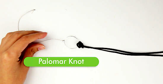 Palomar knot You usually tie a Palomar knot to secure a fishing line to a hook. This is one of the strongest knots used for fishing, and it’s also one of the easier knots to learn. Make a loop in your cord or fishing line by folding the cord in on itself. Feed the loop through the hole at the top of the hook. Pull the loop through so that you have a good amount of line on both sides. Do an overhand knot by crossing the loop over the two strands of cord on the other side of the hook (the “main line”). Pull the loop out through the hole you created after crossing the two pieces of cord. Pull the loop through so that it’s big enough to fit the hook through it. Feed the hook through the loop and then pull the main line to tighten the knot. Use a pair of scissors to cut off the excess cord that isn’t attached to your hook or fishing pole.