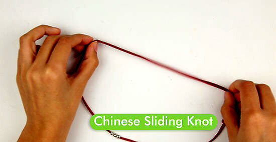 Chinese sliding knot If you’re feeling crafty, use a Chinese sliding knot to make some adjustable necklaces and bracelets. This knot allows you to adjust the tightness of your jewelry simply by sliding the knot up and down the string. Get a length of string that’s 24 inches (60 cm) long. Lay the string on a flat surface. Take one end (end A) and fold it back along the string to create a 6-inch (15 cm) loop. Take the other end (end B) and wrap it around the outer edge of the loop so that end A and end B are lying parallel to one another. Pinch the top of the loop between your fingers with your right hand, then use your left hand to wrap end A around the string below the loop twice. Feed end A through the loop from the back and pull it through to the front. Pull on the piece of string that’s on the other side of the knot to tighten it.