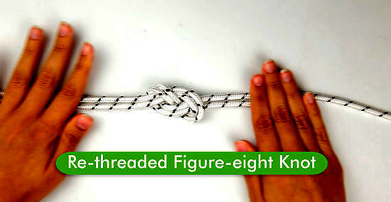 Re-threaded figure-of-eight knot (figure-of-eight follow-through) Tie a re-threaded figure-of-eight knot to tie yourself into your climbing harness. This knot is also commonly used in creating climbing anchors with dyneema or cordelette. Make a loop in the rope by crossing the right end of the rope (end A) over the left end (end B). Make it so that the loop is just about less than halfway down the rope from end A, and leave end A a bit long. Pinch the top of the loop and twist it once to the left. Pull end A through the top of the loop from behind. Pull on both ends of the rope to loosely tighten the knot and form a figure eight. Take end A and thread it back through the knot so that it retraces itself. Follow the path of the existing figure eight and leave a loop at the bottom of the knot. Tighten the knot by pulling on both ends.