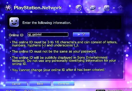 Enter an online ID. This screen asks you to create an ID that can be seen by others online. The online ID needs be 3 to 16 characters long. It can contain letters, numbers, and special characters (such as hyphens and underscores). The ID cannot be the same as your sign-in password, and you cannot change your ID once it is created. You may get the message "The online ID you entered cannot be used." This means either someone else has the ID you have chosen or the ID contains keywords not allowed in online IDs. An example of a keyword would be "PS3."Make a Master Account on PS3 Step 6Bullet1.jpg
