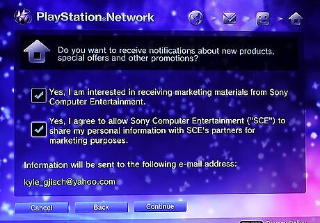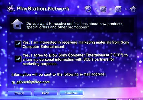 Select the boxes of any information you want sent to your specified email address. You can choose to receive information about PlayStation products and services, as well as information from third-party companies. You can enter a different email address than the one you used to sign in.