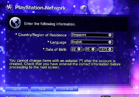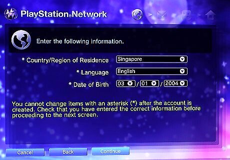 Choose your country, language, and child's date of birth. The next screen explains that a parent or guardian will be needed to help create the account. Select "Continue."Make a Master Account on PS3 Step 12Bullet1.jpg