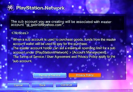 Read the Terms of Service and Privacy Policy. This section explains that the sub account that you are creating will be associated with the master account. A Sub Account Registration Confirmation email will be sent to the master account email. The email will confirm that you have successfully registered for a Sub Account.Make a Master Account on PS3 Step 14Bullet1.jpg