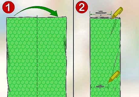 Fold the fabric in half lengthwise, then transfer your measurements. Divide your waist measurement by 4, then make the a mark that distance from the fold. Measure down along the fold based on your waist-to-ankle measurement. Divide your ankle measurement by 4, then make another mark that distance from the fold. Leave enough space below the ankles for the fins. Make sure that you are folding the fabric with the right sides facing in. If your fabric has scales on it, make sure that the scales are all pointing downwards. If this is for an adult woman, include the hip measurement as well. Remember to divide it by 4!