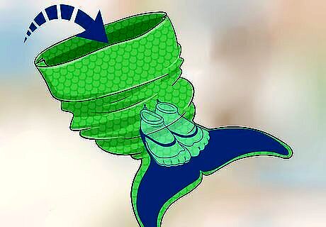 Tuck the mono fin into the tail. You ill need to bend the mono fin in order to fit it past the ankles and into the fin. Nestle the corners of the mono fin into the corners of the fin itself.