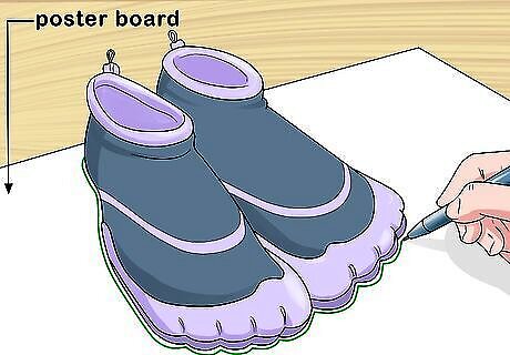 Trace around a pair of water slippers onto a sheet of poster board. Place the slippers on top of a sheet of poster paper, with the heels touching the edge. Make sure that the inner edges of slippers are touching, then trace around them with a pen. Make sure that the water slippers fit you. You will be using them to secure the fin to your feet. If you already have a mono fin that you'd like to use, trace it onto a sheet of poster paper, cut the tracing out, then click here to continue.
