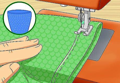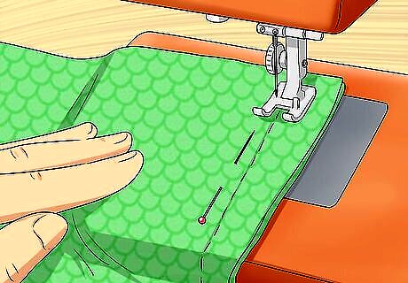 Sew the tail using a 1-inch (2.54-centimeter) seam allowance. Use a ballpoint needle, a matching thread color, and a stretch stitch. Start sewing at one top edge, sew around the tail body and fin, then finish sewing at the other top side. Backstitch at the start and end of your sewing, and remove the pins as you sew. For extra security, sew around the tail three times. If you made a fancy tail, don't sew the fringe.