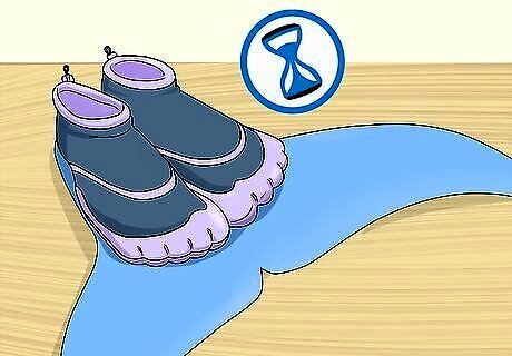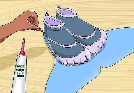 Glue the water slippers to the fin. Place the slippers onto the fin and trace around them. Coat the underside of the slippers and the inside of the tracing with a water-safe glue. Wait for the glue to get tacky, then press the slippers into place. Choose a strong, flexible glue meant for sealing items under water. Glues meant for boating would work well for this. Work in a well-ventilated area. Most types of glue like this can produce fumes.