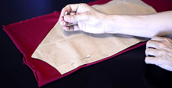 Pin the pattern pieces to the folded fabric. Consult the pattern’s instructions for how and where to pin the pattern onto the fabric. If you created your own pattern, place the edge of the pattern that was along the fold in your shirt along the fold in your fabric. Place the pattern pieces on the folded fabric so that the edges of the pattern pieces are within the borders of the fabric. Then, place a pin along the edges of the pattern every 2 to 3 in (5.1 to 7.6 cm). Make sure that each of the pins goes all the way through the pattern piece and fabric layers. You will likely need to pin the pattern along the fold of your fabric. Check the pattern for the word “fold” with arrows indicating which edge goes along the fold. Place the pattern piece so that the arrows are pointing towards the fold.