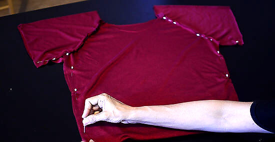 Align the sides of the shirt and pin along the armpits and sides. Fold the shirt material back over so that the right sides of the shirt are facing each other again. Then, insert a pin every 2 to 3 in (5.1 to 7.6 cm) along the sides of the shirt and the undersides of the sleeves. Place the pins about 0.5 in (1.3 cm) from the raw edges of the shirt. Place the pins so that they are perpendicular to the edges. This will make it easier to remove them as you sew.