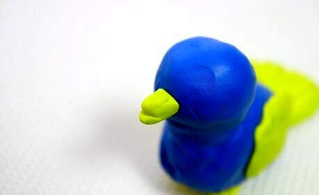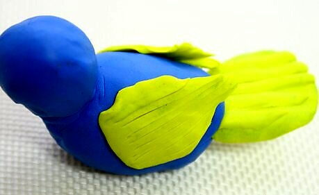 Get a very small piece of clay whatever color you like and shape it into a triangle. Make small separate "hairs". These will be the tail feathers. Stick it to the back of the body on top.