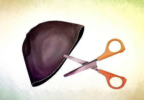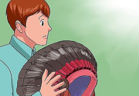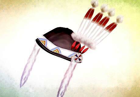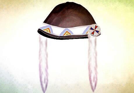 Find a skullcap or headband. Sometimes called a crown, the typical base for a warbonnet is a round cap made from leather or felt. You may also use a long strip of material that can wrap around the wearer's head and be laced together. If intended to be worn, rather than displayed, the cap should be cut so it fits the wearer's head, extending just above the eyebrows and halfway down the ears. Traditionally, this skullcap or headband was made from buffalo or deerskin. You can make your own crown by curling a piece of leather or felt into a dome, cutting off the overlap, then stitching the two pieces together.