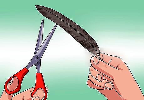 Trim the feather tips and stems. Trim each feather to a rounded butter knife shape, then smooth the veins of the feather together between your fingers so there are no stray or frayed edges. If the stems are broken, cut off the broken portion to make an even end. If the unbroken portion of the stem is shorter than 2.5 inches (6.4 cm), insert a wooden dowel into the hollow end of the stem to make it easier to attach to the warbonnet.