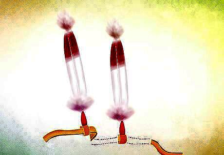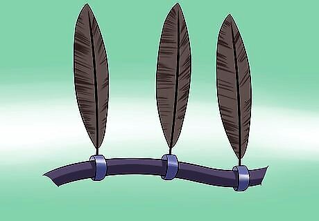 Punch holes into the rim of the cap. Lay the feathers out along the cap or band at regular intervals. Punch holes along the rim of the cap with an awl, or cut small slits using a sharp knife. There should be two holes per feather, directly on either side of the quill stem. The feathers of a warbonnet generally extend at minimum from one ear to the other, curving over the forehead. Feathers can also be worn individually or in small groups on the forehead, as a lesser status symbol.