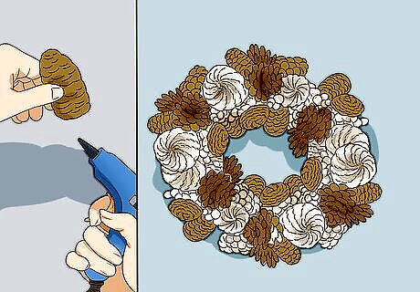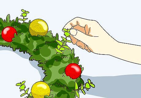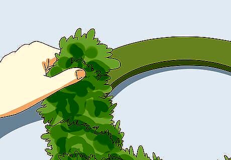 Arrange the base items on your wreath. This includes items such as greenery or large flowers. If you are making a fall wreath on a grapevine base, you could use pinecones for this step instead. If you are using a garland for the wreath base, wrap it around the wreath frame instead so that you can't see it anymore. If you are working with an evergreen wreath, take a moment to fluff up the branches. Wrap a string of battery-operated lights around an evergreen or grapevine wreath for a festive display.