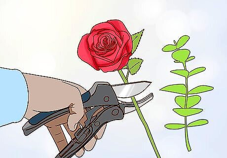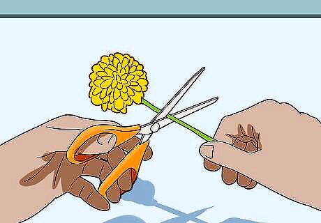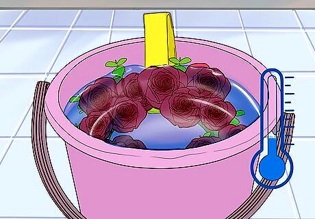 Cut your flowers and greenery. Use garden clippers to cut the stems off of your flowers and greenery until they are 2 to 3 inches (5.1 to 7.6 cm) long. Keep the un-cut flowers and greenery in a bucket filled with cool water. Place the cut flowers and greenery into a sink or bowl filled with cool water as soon as you cut them.
