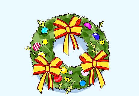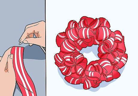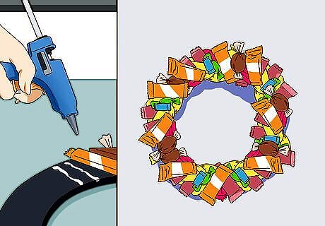 Try a candy wreath for a tasty treat. You can make these with coat hanger, wire, and Styrofoam wreath bases. It all depends on the type of candy that you are using. Most people like to tie wrapped candies (such as mints) to wire and coat hanger wreath bases so that they are removable. Other people like to hot glue their candy to Styrofoam wreath bases for a more permanent display.