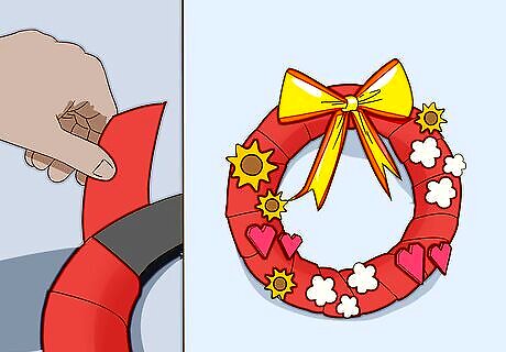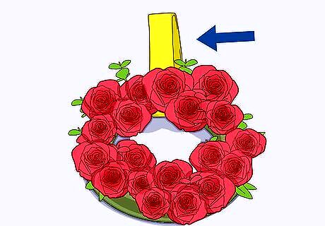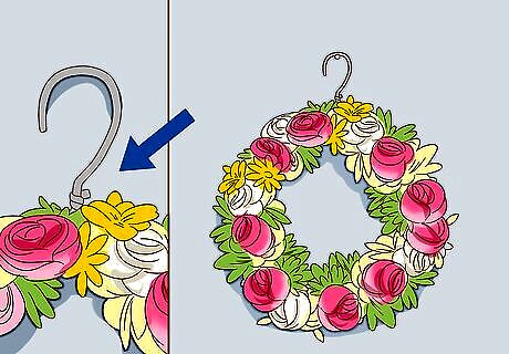 Loop a ribbon around the top of the wreath so that you can hang it. Cut a long piece of wide floral ribbon. Thread it through the middle of the wreath, then tie the ends together into a knot or bow to make a loop. Use the ribbon to hang the wreath as desired.