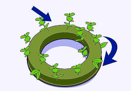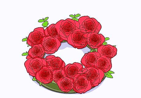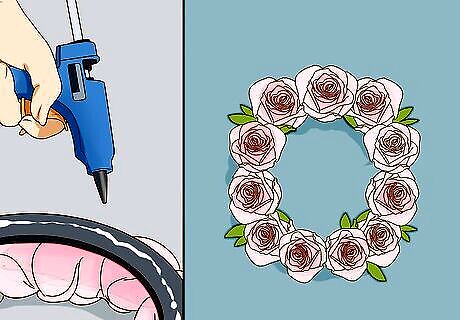 Hot glue the base of the buds to the foam ring. Draw a squiggle of hot glue onto the foam ring, then quickly press a few flowers into it; make sure that the flowers are sticking straight up. Repeat this process until the ring is filled. Start at the top of the ring and work your way around it, like on a clock. Work your way in rows, from the outside edge-in. Do not add flowers to the sides of the foam board; it is too thick. Do not add flowers to the back, or it won't hang properly.
