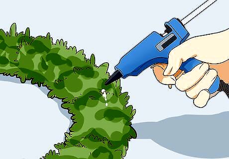 Secure the items with wire or hot glue. Short pieces of floral wire will work great for securing items to wire, evergreen, and grapevine wreath bases. Hot glue or floral U-pins will work better for Styrofoam wreath bases. You can use hot glue for grapevine wreaths too. Hold long branches parallel to the wreath base, then wrap wire around them. Work your way around the wreath, overlapping the branches as you go. If you added battery-operated lights, secure the battery pack to the back of the wreath with bits of floral wire.