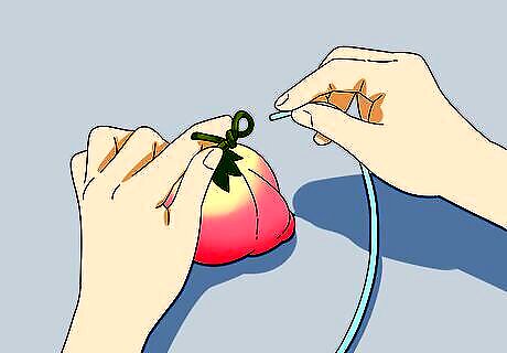 Twist the stems into small loops for stringing onto the hanger. You are not attaching these to the hanger just yet. Instead, twist the flower stem into a loop about halfway down. When you are done, you'll have a flower with a short stem that has a loop at the bottom. Repeat this step for all of your flowers. Use a skewer or knitting needle to form the loops. They need to be small enough to slide onto the hanger.