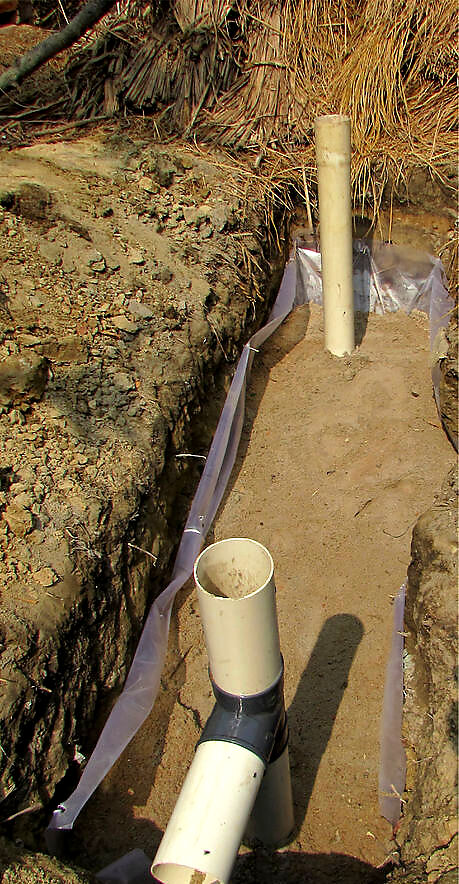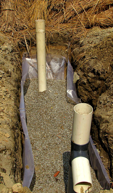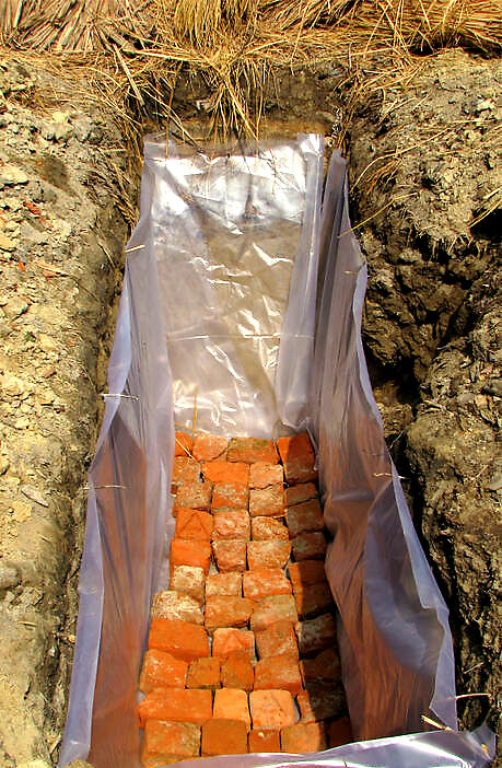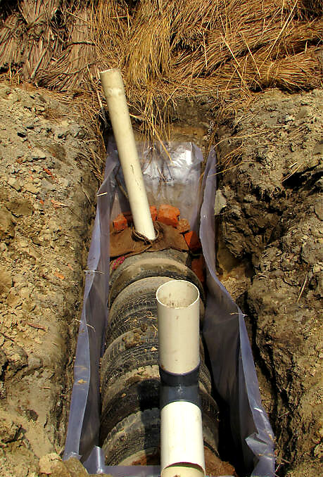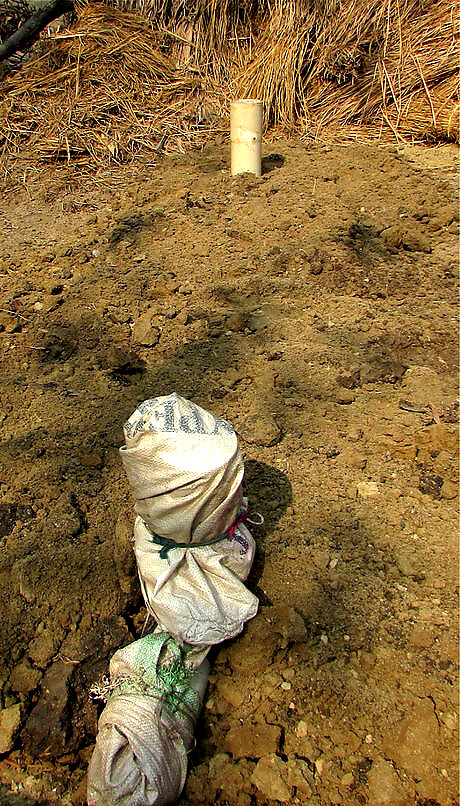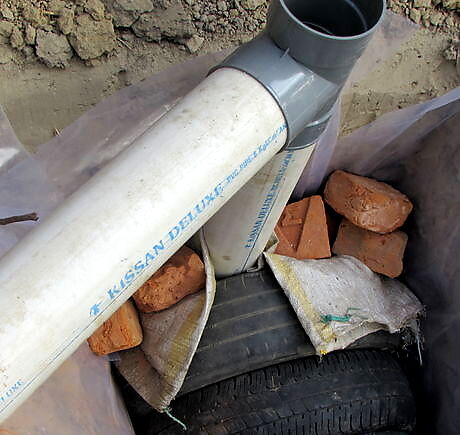 Create a single line of perpendicular tires. Start loading the tires from the front side of the tank. The one foot pipe connected to the elbow goes into the tank – into the tire duct. Use a jute bag, or some variation, to cover the tire’s hole and the front pipe. Secure with big porous stones / broken bricks. 5 tires in the tank start seat side confirm where you wnat the seat to position the pipe IMG_0451.jpg