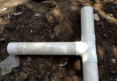 Connect the bottom of the T to the elbow pipe – the top of the 2 foot 6-inch pipe, using sealant. The top of the T connects to a one 1-foot pipe, using sealant. The middle of the T connects to the 2-foot pipe with sealant.