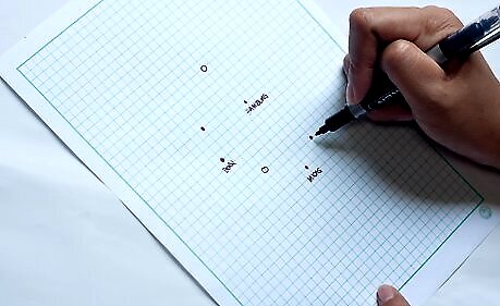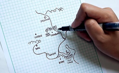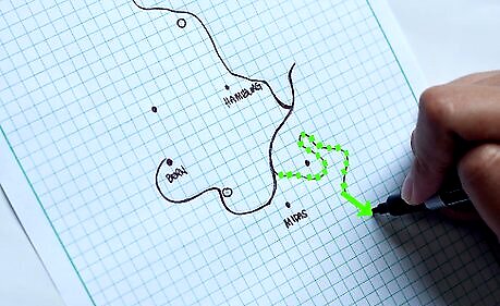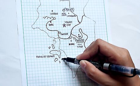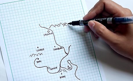 Draw squiggly lines that snake around them all. A few of them might go through towns or cities. Name the lines. These are rivers. You can make one or multiple gather into a circle (a lake) somewhere on the map.
