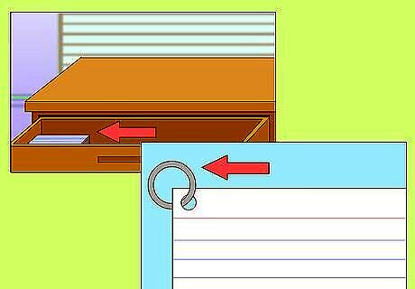 Store your cards in a designated study space. Where you study matters a lot in terms of effectiveness. When you're studying, you should bring all the materials you need and leave behind any unnecessary materials. Try storing your index cards on your desk or workspace. This way, when you go there to study your cards will be there waiting.