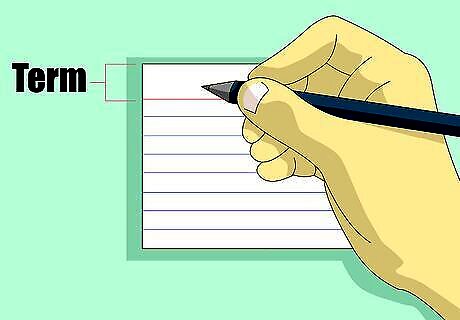 Write down the vocabulary words on one side of the cards. Vocabulary index cards are very simple to make. To start, write down the vocabulary term on one side of each card. Usually, index cards have one lined side and one blank side. It's a good idea to write the vocabulary term on the blank side, as you can use the lines to guide your writing when you write down definitions. Write the words in pencil first and then write over them in pen. Color coordinate the cards as needed. For example, all the vocabulary from English class can be written in red. All the vocabulary from history class can be written in blue. This way, if the cards accidentally get jumbled, you can easily separate them again by subject. You can also color coordinate by difficulty. For example, you could write the vocabulary words you already know in green, the tougher ones in red, and the extremely challenging ones in blue.
