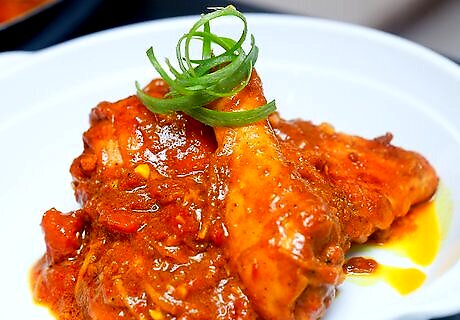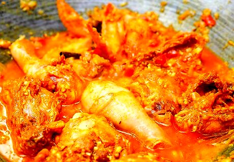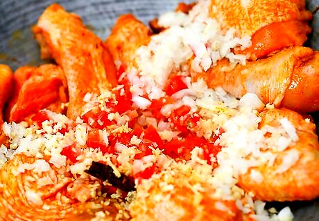 Cook the onions, garlic, ginger, and chili pepper in the pot for 4 minutes. This will cook these ingredients in the spices as well as the aroma of the fried chicken.