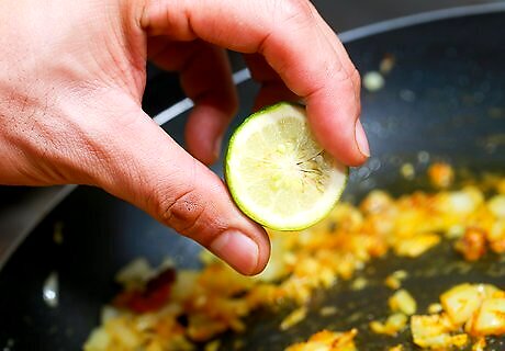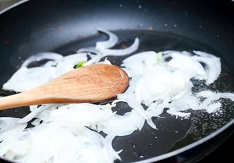 Fry the onion cut in slices. Cook until well fried. You may add garlic slices and chillies at this stage.