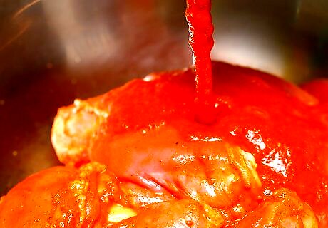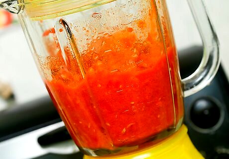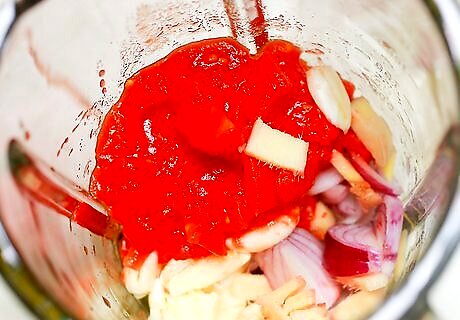 Puree the ingredients. Puree the ingredients together to make the stew for the curry chicken. It should be blended pretty well, with just a bit of chunkiness.