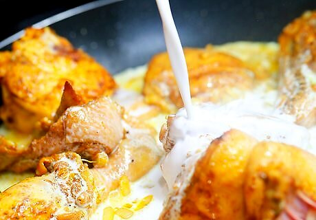 Return the chicken to the pot and cover it with the coconut milk and stock. This will impart a rich, irresistible flavor to the chicken.