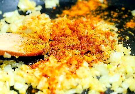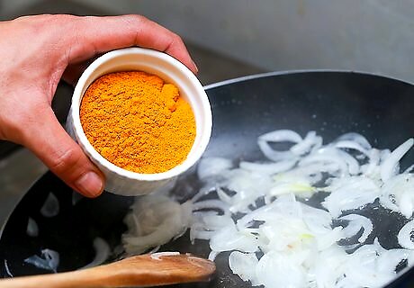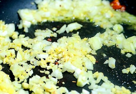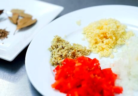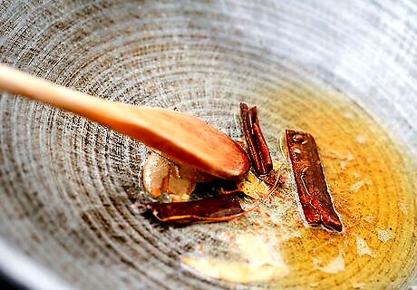 Heat the oil in a deep pan and add the cloves, cinnamon, bay leaf, and cardamom. You can use vegetable oil or olive oil, though ghee will give your curry chicken the most authentic Indian flavor. Here's what you should do: As soon as these spices begin to crackle, you can add the cumin seeds, wait about five seconds, and then add the diced onion. Turn the heat down to medium and sauté the onions until they're soft and translucent, which should take about 2-3 minutes. After that, add the ginger and the garlic. Then, turn the heat up to medium-high and continue sautéing the onions until they are light brown. Continue stirring the ingredients to combine the flavors.