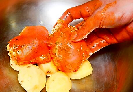 Pour the sauce over the chicken. This will give the chicken and potatoes the delicious curry flavor you're looking for.