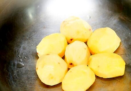 Place the potatoes in the bottom of a slow cooker. Ideally, the slow cooker should be 5 ⁄2 to 6 US quarts (5,204.9 to 5,678.1 ml) large. Spread the potatoes evenly so they are well distributed across the bottom of the pot. You'll be placing the chicken on top of them, so you want to make sure the chicken can impart its tasty flavor to the potatoes pretty evenly.