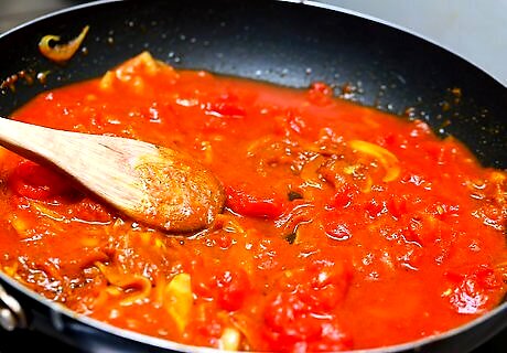 Add the half can of tomatoes (either whole or chopped). Cook gently for 15 minutes.