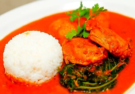 Remove from heat and garnish. Once your chicken curry is cooked, take a bite and add salt and pepper or any spices to taste as needed. Garnish with fresh coriander and serve with plain rice or chapati (Indian bread).