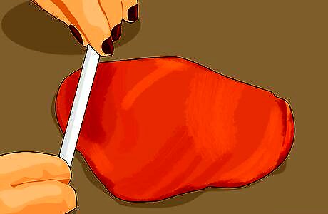 Roll out your clay. After you've gotten your clay to a shade of orange you're happy with, it's time to roll it out. You can use a rolling pin for this step, or any cylindrical object with a smooth surface. Place your clay on the surface you're working on, and use your rolling tool to stretch and flatten it out. Continue going until you've created a flat piece of clay large enough to cover the pumpkin form you created. Don't roll the clay paper thin, or it could break or tear as you wrap it around the pumpkin form.