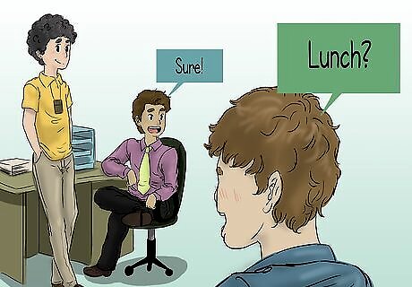 Make yourself available. If you want to make friends, you first need to put yourself out there somehow in order to meet people. If you just sit alone, friends might come to you, but that's not likely because they might think you want to stay alone. For example, if you're still in school, sit somewhere with other people. It doesn't have to be a crowded table, but try to choose one with at least 2 other people. Remember, friends rarely come knocking on your door while you sit at home playing on your laptop. If you see opportunities to get out there and meet people, take them. For example, try going to social functions at school or work. If someone invites you to a party, go for it!