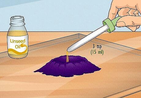 Add ½ tsp (2.5 ml) of extra linseed oil at a time if the mixture is too dry. If you have too much pigment and not enough linseed oil in your original mixture, add more linseed oil. Add only very small amounts at a time so that you can stop when the consistency is correct. You can tell if the mixture is too dry as it will look powdery and won't combine properly.