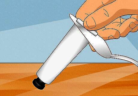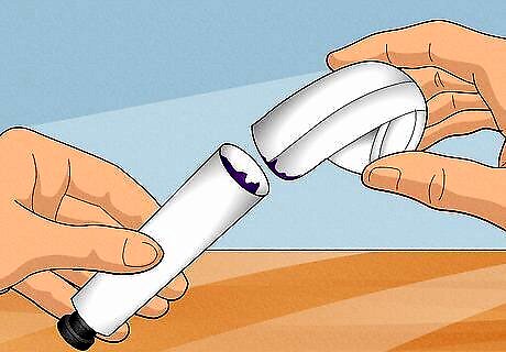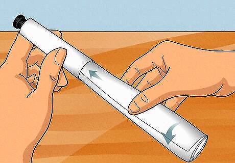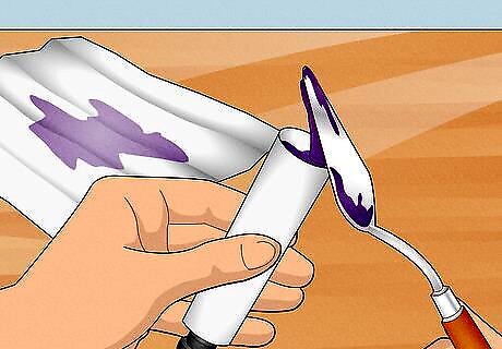 Wrap the disposable palette around a glass bottle to push the paint into the tube. Rest the disposable palette and the paint tube on your work surface. Start with the glass bottle close to you and slowly roll it along the surface and towards the tube, wrapping the paper around it as you go. Make sure that it is wrapped tightly so that the paint will squeeze from the palette and into the tube. The pressure caused by tightly wrapping the paper around the bottle will squeeze the paint out of the paper and towards the tube.
