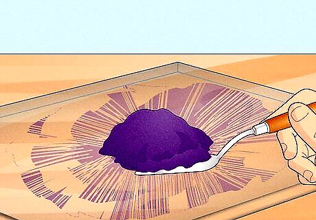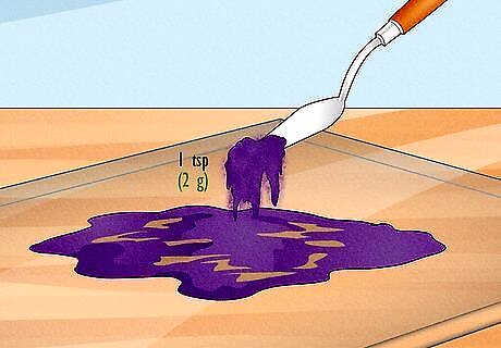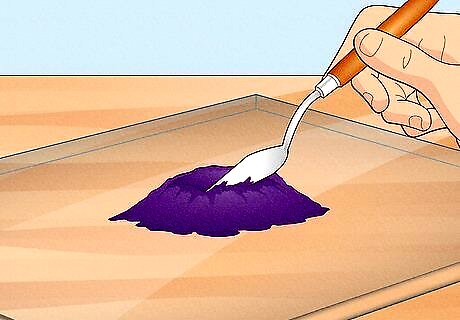Place 2 oz (56.7 g) of dry powder pigment in the center of the grinding slab. Pour the pigment out of the bottle. Use a palette knife to form it into a small mound shape. You can use more or less pigment depending on how much oil paint you would like to make. A wide range of dry powder pigments are available from art stores and online. A grinding slab is a sheet of glass that rests on your workbench. It is the surface that you combine and grind ingredients on to create paint. For this project, an ideal grinding slab size is ⁄4 in (0.64 cm) thick.