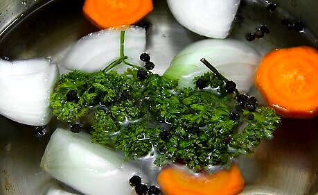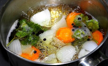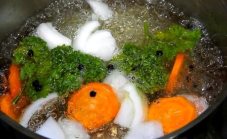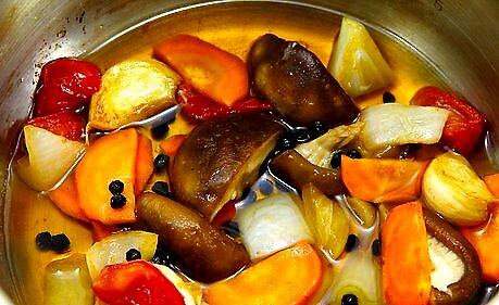 Combine the wine, vegetables, water, and spices. Once the wine is at a simmer, turn it off and pour it into the saucepan with the vegetables. Pour in 6 cups (1.4 liters) of water and add 2 bay leaves and 6 to 8 whole peppercorns.