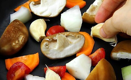 Spread the vegetables in a roasting pan and add oil. Put the onion quarters, mushrooms, tomatoes, carrots, and 3 large cloves of unpeeled garlic into a roasting pan. The vegetables should be in a single layer so they roast evenly. Drizzle 2 tablespoons (30 ml) of grapeseed or other neutral oil over the vegetables and toss them gently. If you'd like to use any extra vegetables, you can add them to the roasting pan.
